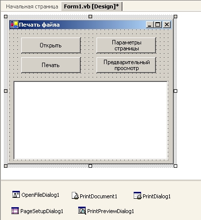 Объект Свойство Установка Button1 Name btnSetup Enabled False Text Параметры страницы Button2 Name btnPreview Enabled False Text Предварительный просмотр Ваша форма будет выглядеть примерно так.