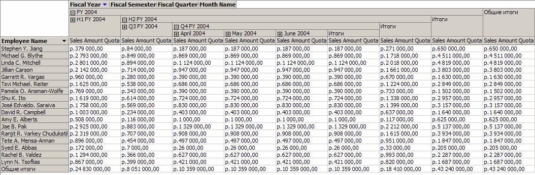 Рис. 11.41. Квота продаж по каждому из сотрудников, которые имеют квоту продаж на каждый месяц четвертого квартала 2004 финансового года