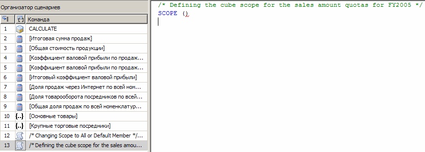 Обратите внимание, что каждая команда сценария появляется в виде, введенном в области "Выражения вычислений", однако в конце ее стоит точка с запятой. Также обратите внимание, что службы SSAS вставили примечание перед каждой командой сценария, которое позволяет понять смысл отдельной команды.