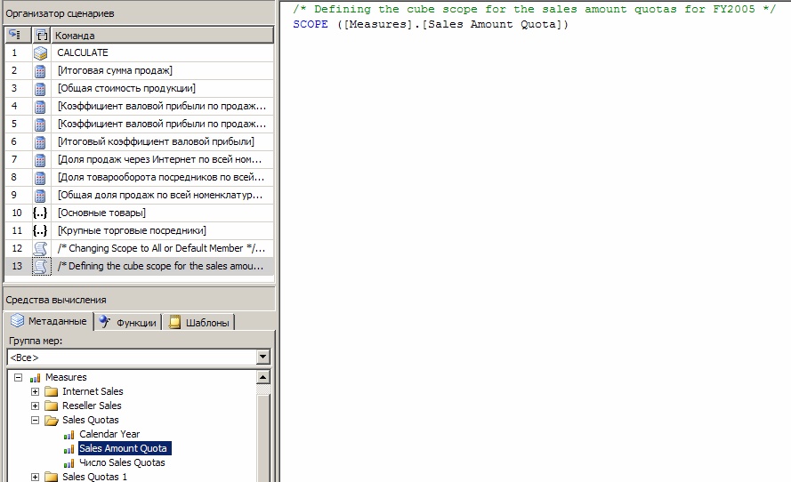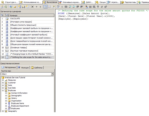 Далее будут применены инструкции SCOPE и THIS, чтобы определить квоты продаж для каждого финансового квартала финансового года 2005. Затем квоты продаж будут распределены по месяцам для всех финансовых годов в кубе. Также будет рассмотрено применение точек останова для отладки сценария вычисления.