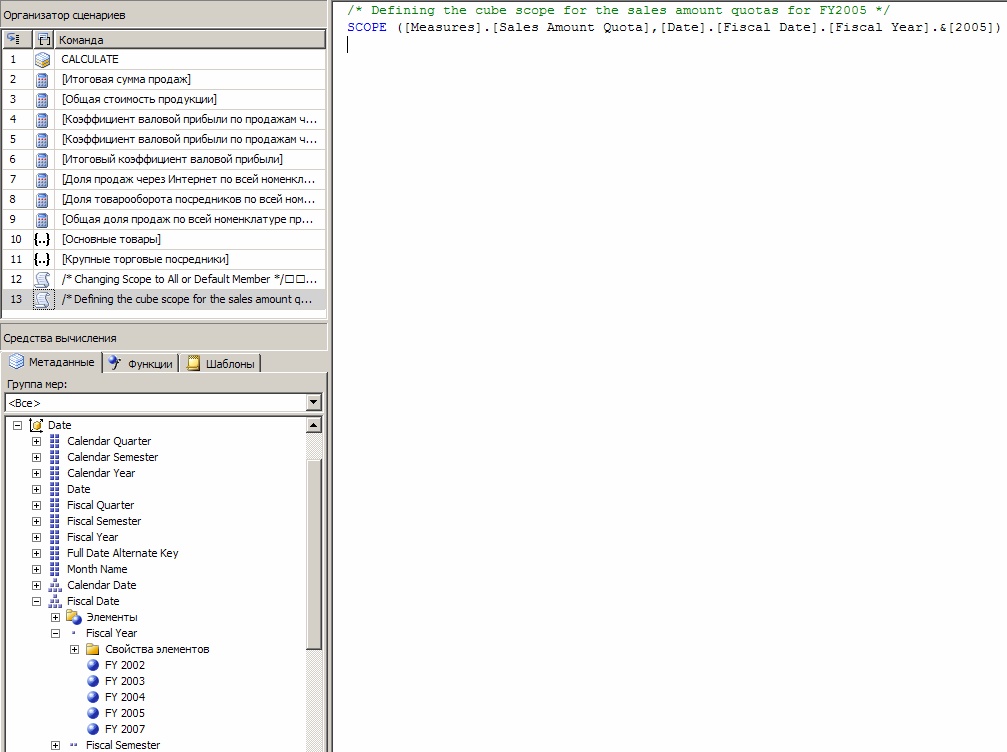 Обратите внимание, что красная волнистая линия исчезла. После этого необходимо добавить элемент измерения "FY 2005" в инструкцию SCOPE, чтобы внести этот элемент измерения времени в текущую область. На вкладке "Метаданные" области "Средства вычисления" раскройте измерение "Date", затем элементы " Fiscal Date ", " Fiscal Year " и перетащите элемент " FY 2005 " в инструкцию SCOPE в области "Выражения вычислений" сразу после элемента [ Sales Amount Quota ] определяемого набора.