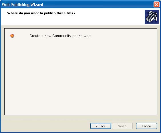 - Щелкните на Создать новое сообщество в веб (Create a new Community on the Web) и затем щелкните на кнопке Далее (Next). Вы будете использовать следующую страницу, чтобы задать параметры вашего сообщества.