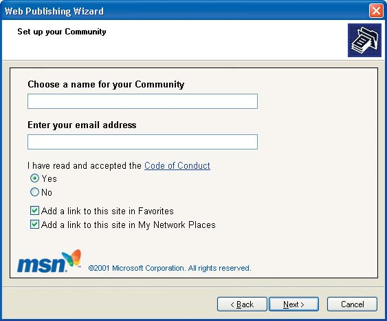 - Введите имя вашего сообщества (выберите что-нибудь необычное), введите свой адрес электронной почты, прочитайте и подтвердите Правила поведения (Code of Conduct) и затем щелкните на кнопке Далее (Next).Совет. Если у вас есть учетная запись Hotmail, то ваш адрес электронной почты, возможно, будет указан автоматически.