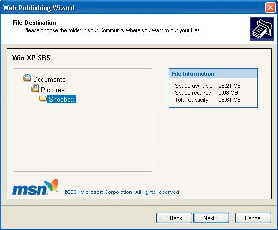 - Оставьте установки по умолчанию и щелкните на кнопке Далее (Next). Ваши файлы с фотографиями будут скопированы на веб-сайт MSN как часть вашего сообщества.