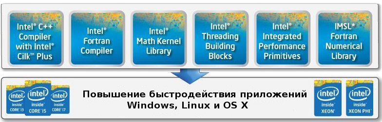 Отлично зарекомендовавшие себя компиляторы и библиотеки С++ и Fortan Intel® Composer XE ориентированный на быстродействие инструмент разработчика, включающий в себя компиляторы Intel C++ и Fortran, а также библиотеки, позволяющие ускорять многопоточные приложения, математические функции, мультимедиа и обработку сигналов.