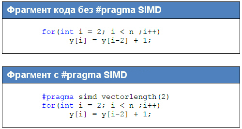 Директивы #pragma SIMD, реализованные в модуле Intel Clik Plus, - мощный инструмент векторизации, дополняющий последовательную семантику C/C++ поддержкой параллелизма на уровне данных с использованием соответствующих SIMD-инструкций. Данная директива указывает компилятору генерировать векторизованный код с определенными параметрами. К примеру, параметр vectorlength задает длину вектора. Поддерживаются также параметры reduction, private, linear, assert, firstprivate, lastprivate и vectorlengthfor. Данная возможность Intel C++ облегчает корректное использование векторизации и позволяет увеличивать быстродействие приложений.