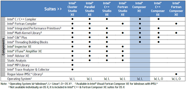 В состав пакета также входят библиотеки: Intel Math Kernel Library (Intel MKL) для сложных математических вычислений и Intel Integrated Performance Primitives (Intel IPP) для обработки мультимедиа, сигналов и данных. Библиотеки предоставляют высокооптимизированные многопоточные функции, ускоряющие разработку и повышающие быстродействие приложений. Дополнение для разработчиков на C++: библиотека Intel Threading Building Blocks (Intel TBB), упрощающая распараллеливание и использование возможностей многоядерных процессоров Intel.