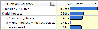 По умолчанию данные группируются по функциям, затем происходит вызов стека для получения списка функций, использующих большую часть времени процессора. Однако перегруппировка данных может выполняться различными способами. Например, перегруппировка по функции, а затем по потоку, чтобы оценить сбалансированность стандартного разделения на потоки.