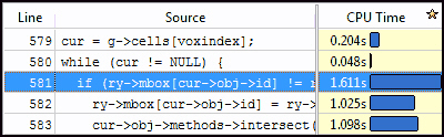 | Функции, использующие большую часть времени, которую процессор затрачивает на операции с плавающей точкой, находятся вверху списка. Дважды щелкните на функции, чтобы увидеть источник с подробной информацией по профилю. |