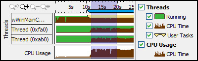 Выберите временной диапазон, используя временную линию, и отфильтруйте данные, чтобы исключить все ненужное за пределами данного временного диапазона. Это приведет к обновлению списка функций, потребляющих большую часть времени процессора для показа потребителей времени процессора на протяжении выбранного промежутка времени. Это позволит вам отфильтровать шум, например, при инициализации, или выделить падение производительности, которое имеет место только в определенный момент времени.