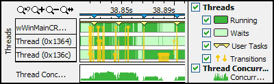 Визуализация поведения потока Следите за выполнением потоков или их нахождением в режиме ожидания, а также за переходами. Балансировка рабочих нагрузок. |