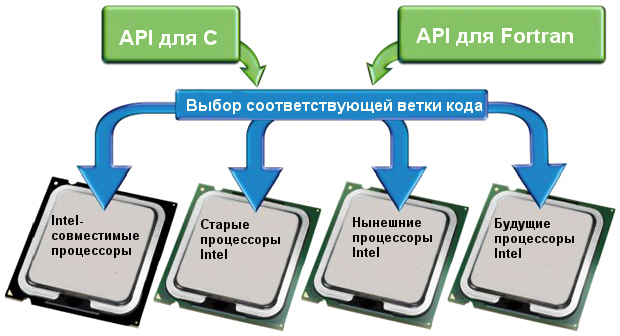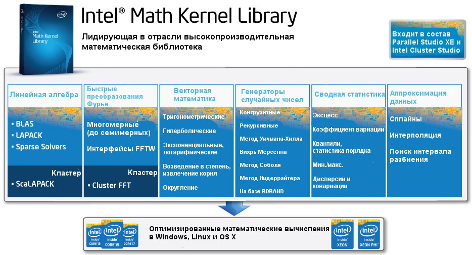В состав Intel MKL входят векторизованные и распараллеленные функции линейной алгебры, быстрых преобразований Фурье (БПФ), векторной математики и статистики. На нынешних, предыдущих и будущих процессорных архитектурах функции библиотеки доступны через одни и те же вызовы API на C или Fortran - в зависимости от архитектуры автоматически выбирается самая оптимальная ветвь кода.