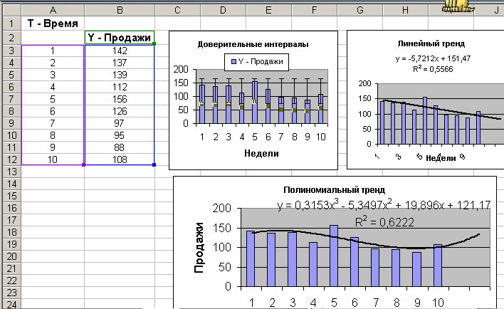 Менеджер начинает работу с визуального анализа данных. Для этой цели он использует возможности визуального представления на диаграмме линии тренда, прогноз значений тренда на требуемый период, возможность задания доверительных интервалов. Эту визуализацию можно сделать как вручную, так и программно. Наш менеджер для таблицы продаж построил три одинаковые диаграммы, на каждой из которых дополнительно вывел: