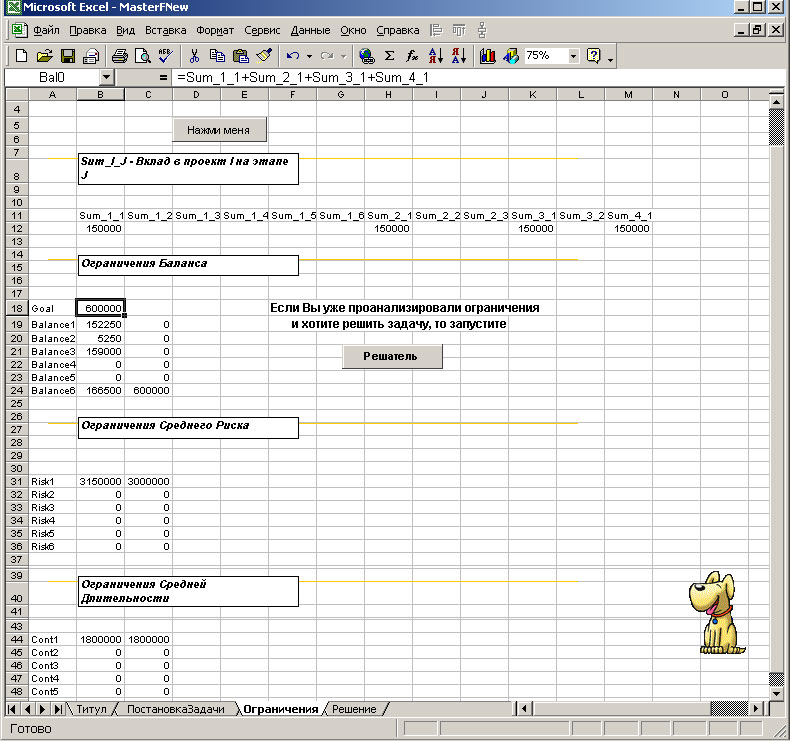 Как видите на странице две надписи и, соответственно, две командные кнопки - "Нажми меня" и "Решатель". По нажатию первой из этих кнопок автоматически создаются переменные задачи, формируется целевая функция и ограничения задачи. Все эти данные размещаются на странице в полном соответствии с требованиями решателя Solver, и в таком виде, чтобы пользователь сумел понять и оценить правильность работы своего помощника. Конечно же, это наиболее серьезная часть той работы, которую выполняет MasterF. Чтобы дать некоторое представление о том, как решаются задачи, возникающие на этом этапе, я приведу лишь одну процедуру, задающую первое балансное ограничение: