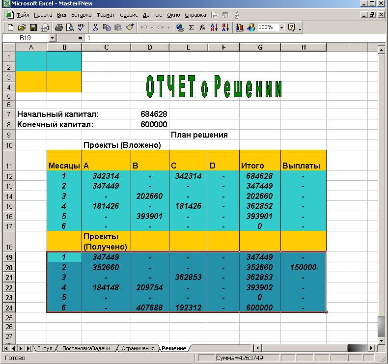 Как следует из отчета, чтобы уплатить на втором месяце 150000, и получить по окончании шести месяцев сумму в 600000, необходимо иметь начальный капитал в размере 684628$. В первый месяц этот капитал следует поровну распределить между двумя проектами - A и C. На третьем и пятом месяце деньги следует вкладывать в проект B. Проект D в решении не используется - у него слишком большая длительность, так что ограничения на среднюю длительность не позволяют использовать этот проект.