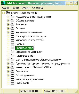 На рис. 1.2 показан полный состав системы BaanERP версии 5.0с (меню администратора системы) и состав модулей подсистемы " Производство ".