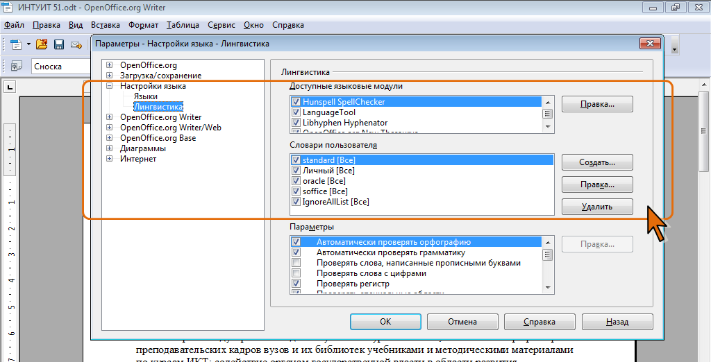 - На странице Настройка языка/Лингвистика окна Параметры (рис. 5.5) можно просмотреть список установленных модулей, их параметры и быстро добавить недостающие модули.