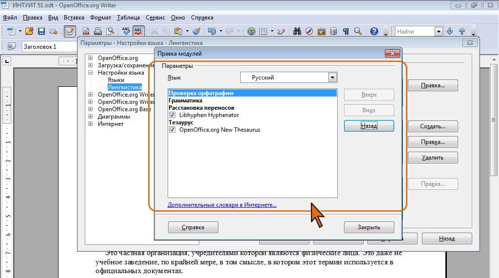 Из рис. 5.6 видно, что в данный момент для русского языка подключены модули расстановки переносов и синонимов (тезаурус), но нет необходимых модулей для проверки орфографии и грамматики.