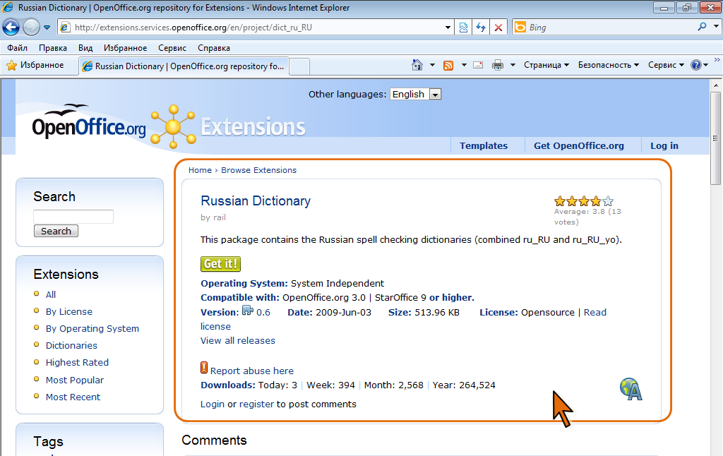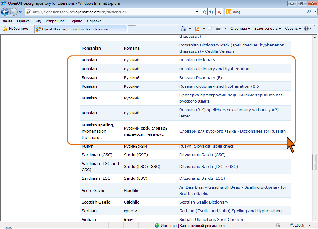 - На странице http://extensions.services.openoffice.org/en/dictionaries отображен список словарей, доступных для установки. Для одного языка может быть несколько словарей. Например, для русского языка в данный момент доступно семь словарей (рис. 5.7)