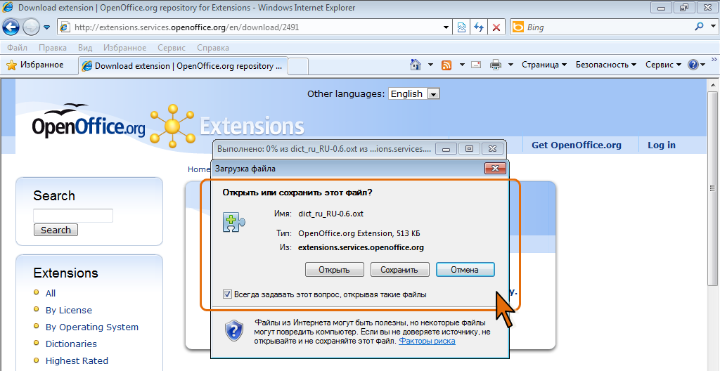 - В окне загрузки файла (рис. 5.9) можно нажать кнопку Сохранить для сохранения файла словаря и последующего его подключения к OpenOffice.org, а можно нажать кнопку Открыть, в результате чего установка словаря начнется непосредственно при загрузке.