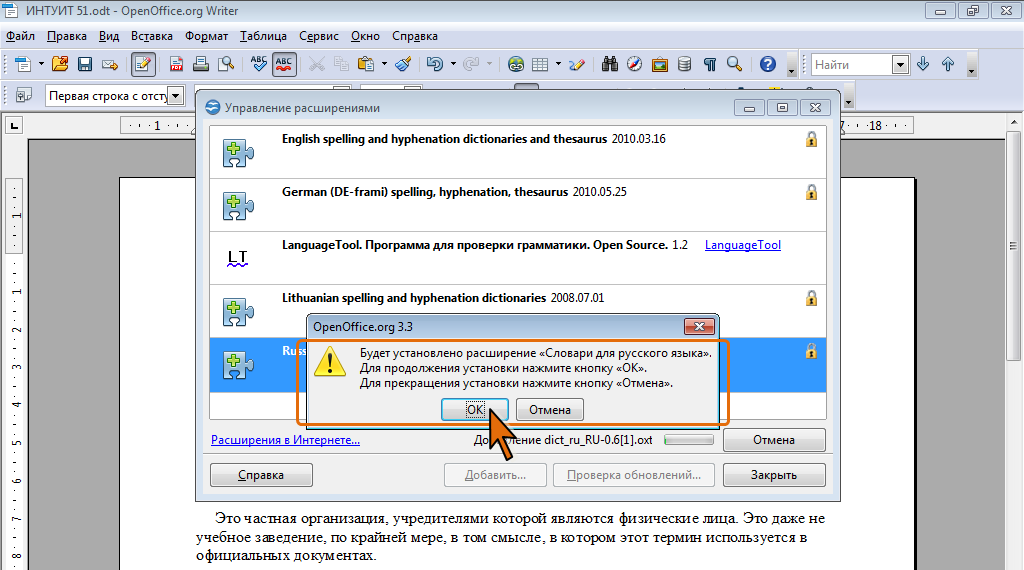 - Подтвердите установку словаря (рис. 5.10), после чего в окне Управление расширениями нажмите кнопку Закрыть.